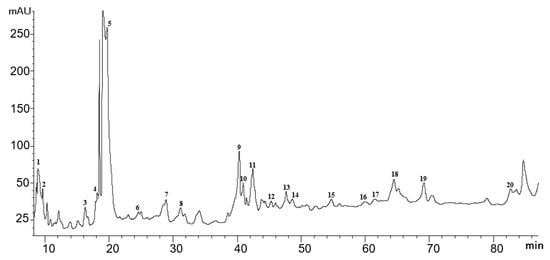 To choose the best HPLC-DAD conditions, two columns with different elution types were tested. First, separation was performed on a reversed-phase C18 column (Brisa LC2) because of its similarity to those used by some authors to analyse glycosidic phenolic compounds []. However, a better peak resolution was obtained with the ACE Excel 3 C18-PFP column, possibly because of its smaller particle size. In terms of elution, different gradients were tested with water (A) and acetonitrile (B) as eluents. The best results were observed with the following gradient for Solvent B: 0 min, 1%; 3 min, 2.5%; 13 min, 2.5%; 14 min, 5%; 34 min, 5%; 35 min, 9%; 35.5 min, 9%; 36 min, 10%; 56 min, 10%; 57 min, 11%; 57.5 min, 11%; 58 min, 12%; 78 min, 12%; 79 min, 15%; 83 min, 15%; 88 min, 100%; 93 min 100%. The wavelength used was 195 nm because this is the most adequate for our objective.