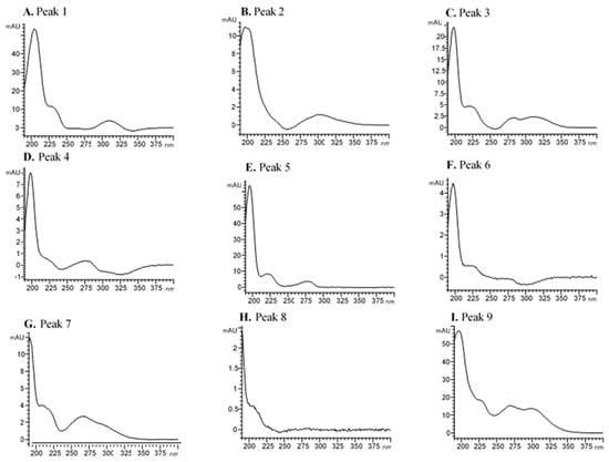 One possible dihydromonoterpenetriol hexose pentose (MW 482.2363 g/mol) was selected in the studied grapes (peak 9; Table 1). Putative identification was performed in the presence of pentose (m/z 131.0344 and 249.0450) and hexose (m/z 161.045 and 179.0556) moieties and [M-H]− ions with m/z 463.2175. Although no aglycone fragments were found in the fragmentation spectra, with no discernible fragments that can unequivocally identify this glycosidic compound, this is the only compound in our database with this parent ion. In the HPLC-DAD chromatogram, however, it was identified at 40.41 min (Figure 2), with 10% acetonitrile in the gradient. Notably, the spectrum of this compound showed three maxima at 197, 269 and 298 nm and a shoulder at 228 nm (Figure 3I). According to Caffrey et al. (2020) [], the dihydromonoterpenetriol aglycone of this compound may be dihydroxy-dihydrolinalool (triol).