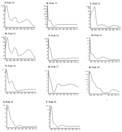 As seen in Figure 2, 20 intact glycosidic aroma precursors were previously selected by using the HPLC-DAD method, and it was possible to identify aglycones in 12 of them by HPLC-qTOF-MS. All peaks selected as glycosidic aroma precursor were identified taken as a reference the phenyl β-D-glucopyranoside spectrum at 195 nm (Figure S1), which showed maximum UV absorbance at 195, 210 and 266 nm. This compound (C12H16O6, MW 256.25 g/mol) is commonly used as a standard in the analysis of glycosidic aroma precursors []. In all cases, the results indicated that there was a significant amount of absorption in the UV area. Specifically, the maximum absorption ranged from 190 to 230 nm, which could be attributed with sugars of the molecule by due to the similarity with their UV spectrum (Figure S2). Moreover, a shoulder was observed around 200–360 nm, which could be attributed to the aglycone.