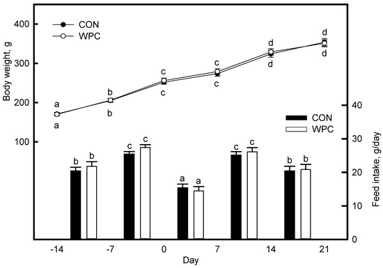 WPC (Alacen 878) containing 79.5% crude protein, 10% crude fat, 8.0% lactose, 0.78% Ca, and 0.2% P was obtained from New Zealand Milk Products, Inc. Based on the NIH-31M diet, the control and WPC diet were formulated to contain 10 g of the amino acids mixture per 1 kg of feed (group CON) and 10 g of WPC per 1 kg of feed (group WPC) (Table 1). The amino acids mixture was formulated based on the nutrients composition of WPC to generate isocaloric and isonitrogenous diets with supplementation of essential amino acids.
