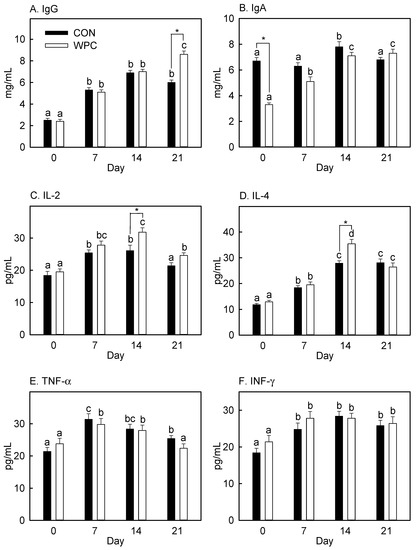 The blood cell populations are presented in Table 2. The populations of red blood cells and platelets were not affected by dietary treatments or antigen injection throughout the experiment. Before antigen injection, dietary treatments did not affect the white blood cell counts, but, after antigen exposure, the white blood cells increased numerically in both dietary treatments (p = 0.07). The percentage of neutrophil in white blood cells was not changed by dietary treatments before antigen injection but decreased after antigen injection, and these decreases differed between the dietary treatments. Group WPC showed significant decreases in the neutrophils after Day 7, and further decreases were found on Days 14 and 21. Group CON showed no difference on Day 7, but significant decreases afterward (Days 14 and 21; p < 0.04). Compared to group CON, group WPC showed greater decreases in neutrophils, and these decreases were significant (p = 0.03). Other granulocytes accounted for less than 3% of white blood cells and did not show any changes due to dietary treatment or antigen injection, or both. Dietary treatments alone did not affect the percentage of lymphocytes (Day 0), but both groups (WPC and CON) changed differentially after antigen injection. Group WPC showed numerically increased lymphocytes on Day 7 and significant increases on Days 14 and 21, while group CON showed numerical increases on Days 14 and 21. No significant differences in lymphocyte proportion were found until Day 14, and the lymphocyte proportion was significantly less in group WPC than in group CON on Day 21 (p = 0.05).