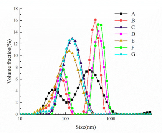 Protein particle size is an important factor affecting the functional properties of soy protein, and differences in particle size may lead to different functions [38]. The particle size distribution of the oxidized SPI after cavitation jet treatment is shown in Figure 1. The particle size of SPI increased significantly with the increase in the AAPH concentration (p < 0.05). The results suggested that oxidation could expand part of the protein structure, expose more hydrophobic groups, and increase the volume of the protein structure. AAPH induced the formation of soluble aggregates of soybean protein, and further oxidative expansion promoted the formation of insoluble precipitates and peroxidation of peptide chains [8,35].
