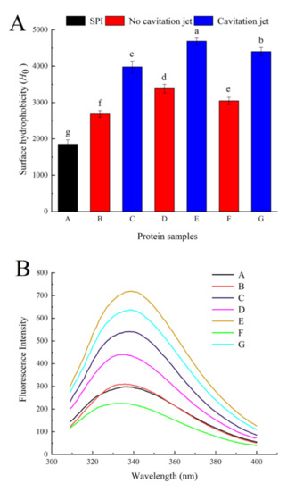 Surface hydrophobicity (H0, A) and intrinsic fluorescence emission spectrum (B) of oxidized SPI before and after cavitation jet treatment. Columns with different letters (a–g) are significant differences (p < 0.05).