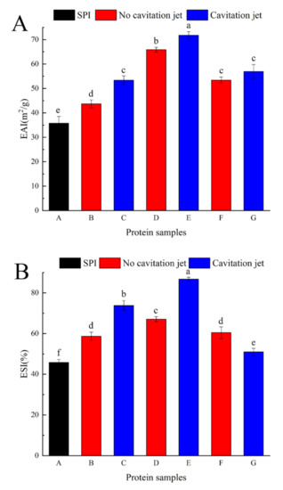 EAI and ESI are always used to evaluate the emulsifying properties of proteins. EAI indicates the ability of the protein to form an oil–water interface, and ESI is the ability of the emulsion to stabilize at the oil–water interface after a predetermined period of time [45].