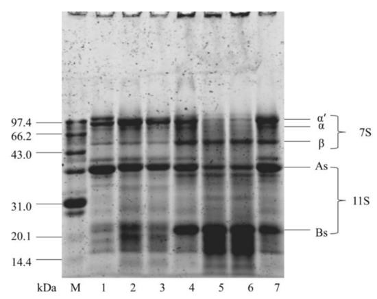 Sodium dodecyl sulfate–polyacrylamide gel electrophoresis (SDS-PAGE) analysis of proteins was performed as described by Laemmli [31]. SPI solution was suspended in phosphate buffer (0.02 mmol/L, pH 6.0) at a concentration of 1.5 mg/mL. SPI solution (1 mL) was added to 4 mL of sample buffer and heated for 5 min. The Bio-Rad MiniProtean3 system was used as a discontinuous buffer system on a 5% stacking gel and a 12% separating gel with a constant current set to 25 mA for approximately 1.5 h. The protein band was stained with Coomassie Brilliant Blue G-250 and then decolorized with 7% acetic acid (methanol: acetic acid: water, 227:37:236 (v/v/v)). A pre-stained protein molecular weight marker (10–170 kDa) was run on the same gel to identify the molecular weight of the protein bands in the stained gel.