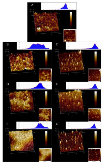 The 3D-view height-view (bottom right illustration) and cross-section (upper right illustration) Atomic Force Microscope (AFM) image of SPI oxidized before and after cavitation jet treatment. Note: Scale bar is 3 μm. (A)–(G) represents protein samples.