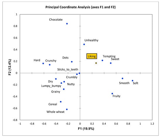 Principal coordinate plot based on CATA descriptions and liking of eight biscuits for the whole sample of children (n = 509).