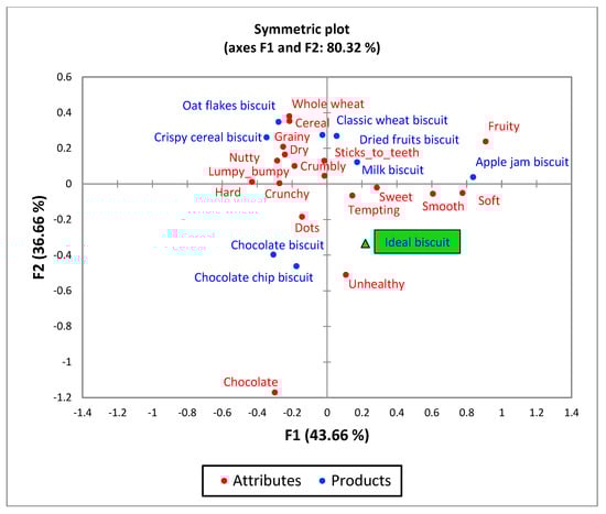 Symmetric plot based on CATA descriptions of 8 biscuits as well as of the children’s ideal biscuit for the whole sample of children (n = 509).