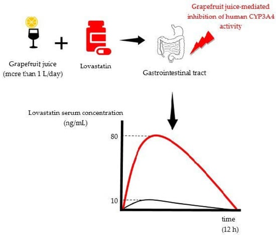 The most extensively described DIs with fruit juices are those with grapefruit juice (and grapefruit pulp), for which it is reported to have more than 40 DIs in humans [28]. Therefore, grapefruit juice that was consumed with the medicine lovastatin was used as a representative example for illustration of a DI, shown in Figure 1. The figure shows the CYP3A4 inhibition by the grapefruit juice, leading to development of adverse effects; i.e., myopathy and rhabdomyolysis. Additionally, a human PK study confirmed that Cmax and the AUC of lovastatin, when taken with grapefruit juice, were increased about 12-fold and 15-fold, respectively [29,30,31].