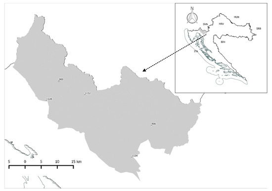 The research was conducted in the Gorski Kotar region (Figure 1). Gorski Kotar is a mountainous region in western Croatia with small plateaus and fields lying mainly in the Kupa River Valley. Forests are composed mainly of fir (Abies alba) and spruce (Picea abies) at elevations between 200 and 1533 m a.s.l. The climate is mountainous with a Mediterranean influence and a mean annual temperature of 7.7 °C and a mean annual rainfall of 2.079 L/m2. The Gorski Kotar region is inhabited by four large game species: Wild boar, roe deer (Capreolus capreolus), red deer, and Alpine chamois (Rupicapra r. rupicapra). Moreover, the region is inhabited by three large carnivore species: Brown bear, wolf (Canis lupus), and Eurasian lynx (Lynx lynx) [31].