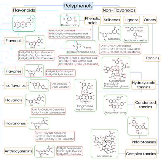There are several ways to classify polyphenols including their origin, biological function, and chemical structure [24,27]. This last one is probably the most adopted classification and divides polyphenols into two main groups: flavonoids and non-flavonoids (Figure 2) [25].