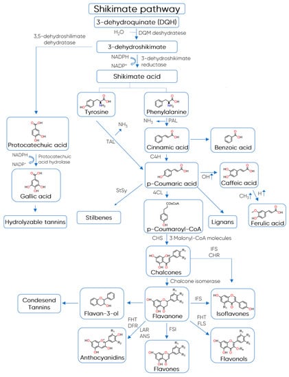 The biosynthesis of polyphenols involves a complex network of routes that include the metabolism pathways of shikimic acid and malonic acid [52]. While the first one produces the most plant phenolic compounds, the second pathway (malonic acid) is an important source of phenolics in bacteria and fungi but is less significant in higher plants [52]. The shikimate pathway converts simple carbohydrates derived from the pentose phosphate pathway and glycolysis into the aromatic amino acids tyrosine and phenylalanine, which are the precursor compounds of the phenylpropanoids (Figure 3) [53]. In most vascular plants, phenylalanine is the primary substrate for phenylpropanoid synthesis, while tyrosine is used to a lesser extent in some plants [53].