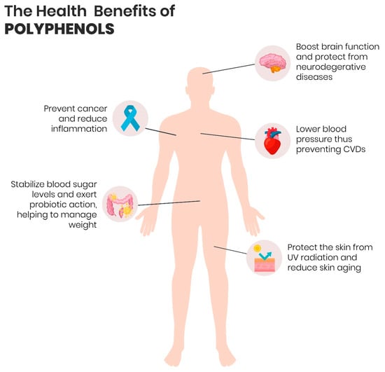 Non-communicable diseases (NCDs), mainly cardiovascular diseases (CVDs), cancer, chronic respiratory diseases, neurodegenerative diseases (NDs), and diabetes, represent a severe burden worldwide. According to the most recent data, NCDs caused over 70% of the 57 million deaths worldwide in 2016 [1]. The major risk factors contributing to this scenario have been identified as the combination of an unhealthy diet, poor physical activity, and alcohol and smoking abuse. Diet, in particular, is considered a leading risk factor for illness, death, and disability and it is estimated that one in five deaths are associated with a poor diet [2]. For this reason, dietary intervention holds great potential in the prevention, mitigation, or even treatment of the most prevalent NCDs. In fact, epidemiological evidence shows that the prevalence of CVDs, cancer, diabetes, and neurodegenerative diseases is lower in populations with diets involving higher ingestion of bioactive compounds, namely the Mediterranean diet [3,4]. For this reason, “functional foods” containing components that can protect our health are becoming very popular. In this context, this review is devoted to the effect of bioactive compounds present in food—in particular, phenolic compounds. Beyond their characterization, we will span the protective effects of polyphenols in cancer, CVDs, and NDDs; highlight pertinent questions regarding their bioavailability and bioaccessibility; and explore new applications in environment, food, and cosmetic industries. Finally, emerging sustainable extraction techniques and methodologies for polyphenols quantification will also be addressed.