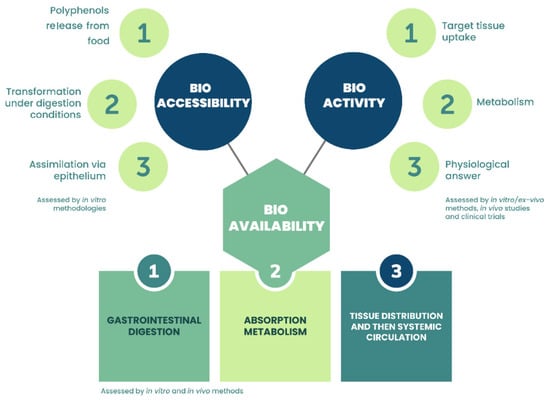 Polyphenols are present in several components of a normal diet and the intake of these compounds can be fundamental for maintaining good health. However, the processes of metabolization, transport, and distribution of these compounds to the target organs are very complex and can affect the structure and, consequently, the bioactivities of such compounds [100,101]. Absorption of polyphenols in the gastrointestinal tract (GI) depends mainly on two factors: bioaccessibility and bioavailability. Bioaccessibility is associated with the amount of these compounds that is available to undergo the process of metabolization; it may be influenced by the interaction of polyphenols with food components, e.g., proteins, lipids, and carbohydrates, and by food [100,101], while bioavailability refers to the ability of these compounds to be metabolized and distributed throughout the body (Figure 5).
