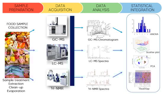 The general workflow followed in food analysis is based on four important steps (Figure 7): (i) sample preparation, which includes the sample pre-treatment and/or treatment, the extraction procedure, the extract clean up, and in most cases, extract concentration by evaporation; (ii) the data acquisition using high-resolution analytical techniques, namely gas chromatography mass/spectrometry (GC-MS), liquid chromatography/mass spectrometry (LC-MS), and nuclear magnetic resonance (NMR), depending on the aim of the study and targeted analytes; (iii) the data acquisition processed by the equipment software; and (iv) multivariate statistical analysis, which may include analysis of variance (ANOVA), principal components analysis (PCA), the partial linear square analysis combined with discriminant analysis and cross-validation, among others, depending on the aim of the study.
