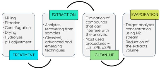 Typically, the sample pre-treatment/treatment is the most time-consuming step. It depends on sample complexity, physical state of the sample-liquid or solid, and the specific analytical needs (target analytes). Filtration, dilution, and centrifugation are procedures most related with liquid samples, whereas solid samples are usually submitted to drying (freezing with liquid nitrogen, freeze-drying, or air drying) followed by a milling or grinding process to reduce the particle size. This is important to increase the contact surface and consequently improve the extraction efficiency. The ideal procedure for sample preparation should remove potential interferents, present high recoveries and high reproducibility, be easy to automate for high sample throughput, be rugged, agree with green chemistry principles, and very importantly, should be fast and cost-effective. Figure 8 present a scheme of the strategy usually employed for the sample pre-treatment before analysis.