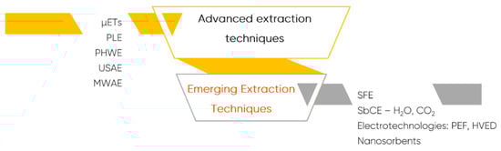 During the last two decades and to overcome the drawbacks of CETs, several new advanced extraction techniques, and more recently, emerging extraction techniques, emerged as highly efficient, faster, cheaper, and “greener” alternatives for the pre-treatment of complex samples (Figure 9).
