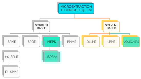 Sorbent and solvent-based microextraction techniques. Legend: SPME—Solid-phase microextraction; HS-SPME—Solid-phase microextraction in headspace mode; DI-SPME—Solid-phase microextraction in direct mode; MEPS—microextraction in packed syringe; µSPEed—miniaturization of MEPS; PMME—polymer monolith microextraction; DLLME—dispersive liquid-liquid microextraction; LPME—liquid phase microextraction.