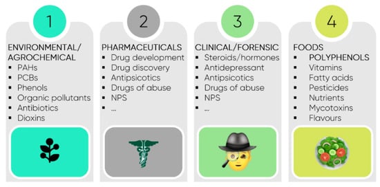 The range of applications of advanced and emerging extraction techniques is very broad and includes environmental, agricultural, pharmaceutical, clinical, and forensics fields. In terms of target analytes, a vast number of them have been reported beyond FBCs and polyphenols, in particular (Figure 11).