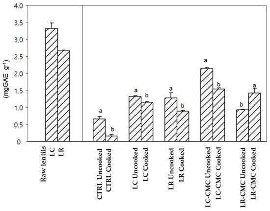 As can be seen in Figure 1, total phenol content (TPC), determined in the commercial lentil was 3.32 mg GAE g−1, while in the Ragusa lentil was 2.68 mg GAE g−1. Comparing the uncooked samples, the total polyphenols ranged from 0.66 (control) to 1.30 mg GAE g−1 (LC/LR). Without the hydrocolloid the TPC content has been reduced by 20% compared to uncooked samples. After cooking, a reduction in TPC accounting for about 28% was shown in all the pasta samples. Specifically, TPC for the uncooked LC-CMC was 2.14 mg GAE g−1 while it was 1.42 mg GAE g−1 after cooking. For LR-CMC the TPC was 1.42 mg GAE g−1 for the uncooked pasta and 0.93 mg GAE g−1 after cooking.