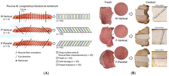 Schematic representation of pork loin (M. longissimus thoracis et lumborum) chop preparation. (A) Preparation method of pork loin chops cut in different directions: M-Vertical, cut vertical to the longitudinal direction of loin muscle; F-Vertical, cut vertical to the muscle fiber orientation; F-Parallel, cut parallel to the muscle fiber orientation. Fresh, at 1 day postmortem stored at 1 °C; Cold storage, stored at 1 °C for 7 days; freeze–thawed, frozen at −20 °C for 5 days and thawed at 1 °C for 2 days. (B) Representative images of fresh and cooked pork loin chops cut in different directions.