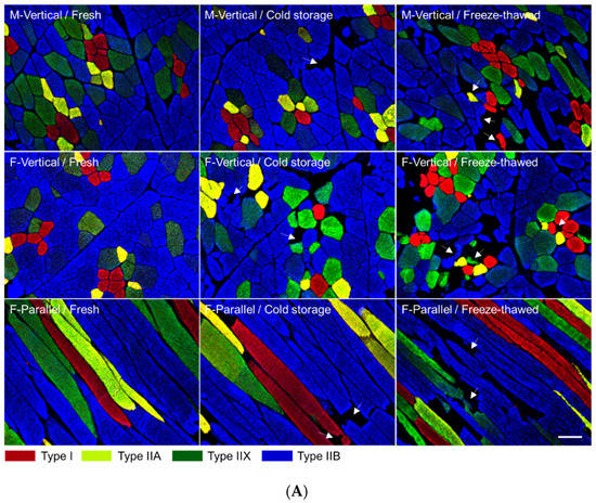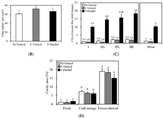 Immunohistochemical analysis and evaluation of chop surface area and muscle fiber characteristics. (A) Representative stained sections of pork loin chops cut in different directions: M-Vertical, cut vertical to the longitudinal direction of loin muscle; F-Vertical, cut vertical to the muscle fiber orientation; F-Parallel, cut parallel to the muscle fiber orientation. The merged images were obtained from three different sections incubated individually with antibodies, BF-35, SC-71, and BF-F3, specific for the four types (I, IIA, IIX, and IIB) of muscle fibers. Arrowheads indicate damaged muscle fibers. Bar indicates 100 μm. Evaluation of (B) surface area of pork loin chop, (C) cross-sectional area (CSA) of muscle fiber, and (D) cavity area. Fresh, at 1 day postmortem stored at 1 °C; Cold storage, stored at 1 °C for 7 days; freeze–thawed, frozen at −20 °C for 5 days and thawed at 1 °C for 2 days. x–z letters on the bar indicate significant difference (p < 0.05) between pork cut groups. a–c letters on the bar indicate significant difference (p < 0.05) between muscle fiber types or storage methods within the same cut group.