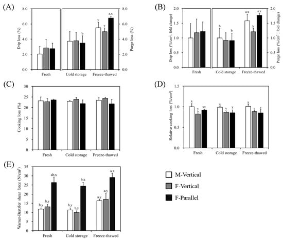 Comparison of water-holding capacity and tenderness of pork loin chops cut in different directions. (A) Drip loss of fresh chop and purge loss of aged or freeze–thawed chops. (B) Relative drip or purge losses per unit area of chop surface. (C) Cooking losses of fresh, aged, and freeze–thawed pork loin chops. (D) Relative cooking loss per unit area of chop surface. (E) Warner-Bratzler shear force of fresh, aged, and freeze–thawed pork loin chops. M-Vertical, cut vertical to the longitudinal direction of loin muscle; F-Vertical, cut vertical to the muscle fiber orientation; F-Parallel, cut parallel to the muscle fiber orientation. Different letters on the bar indicate significant differences between loin cut groups (x, y) or between storage methods (a, b) at p < 0.05.