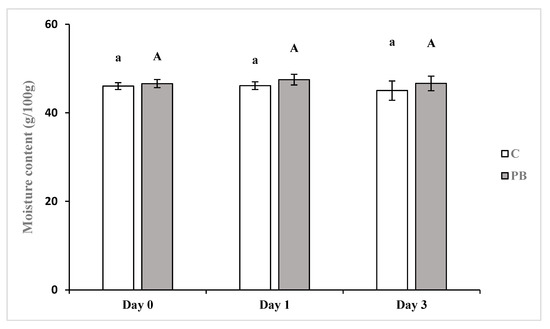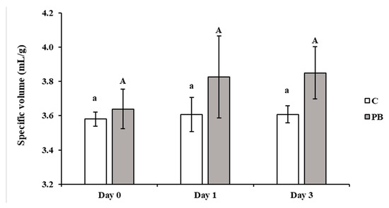 | Crumb | Day 0 | 85.86 ± 0.74 a | 69.11 ± 1.96 a | *** | −0.66 ± 0.08 b | 3.38 ± 0.24 b | *** | 11.68 ± 1.08 a | 16.20 ± 0.74 a | *** |
