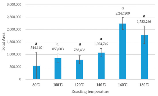 Total Peak Area of shiitake mushroom roasted in six different temperatures. 80 °C represents shiitake mushroom roasted at 80 °C; 100 °C represents shiitake mushroom roasted at 100 °C; 120 °C represents shiitake mushroom roasted at 120 °C; 140 °C represents shiitake mushroom roasted at 140 °C; 160 °C represents shiitake mushroom roasted at 160 °C. Alphabetical letter “a” followed by numbers represent no significant differences in peak area ration between shiitake mushroom samples roasted in different temperatures.