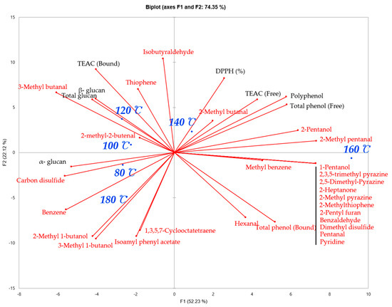 Principal Component Analysis Biplot on antioxidant, β-glucan and volatile flavor profiles of shiitake mushroom roasted in six different temperatures. 80 °C represents shiitake mushroom roasted at 80 °C; 100 °C represents shiitake mushroom roasted at 100 °C; 120 °C represents shiitake mushroom roasted at 120 °C; 140 °C represents shiitake mushroom roasted at 140 °C; 160 °C represents shiitake mushroom roasted at 160 °C.