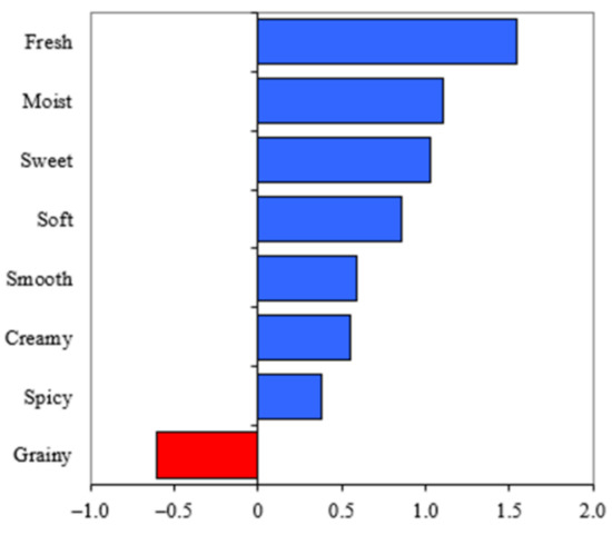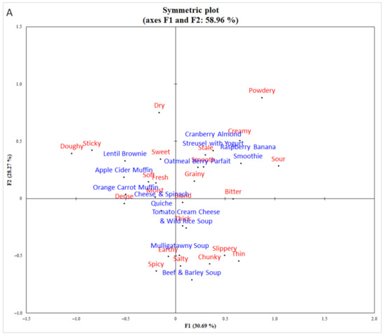 The symmetric plot in Figure 1 shows each food and its relationships to the sensory attributes from the CATA exercise, as well as the products’ relationships to each other. The first two factors explained 59% of data variability, which is comparable to Ares et al. [26], where specific groupings were observed based on product-type. The ten foods were grouped as baked products (two muffins and lentil brownie), three soups, and foods containing prominent dairy products (raspberry banana smoothie, oatmeal berry parfait and cranberry almond streusel with yogurt), with the cheese and spinach quiche in its own quadrant. The penalty analysis test showed that overall liking was positively affected by fresh, moist, sweet, soft, smooth, creamy and spicy perceptions, and negatively impacted by graininess (Figure 2).