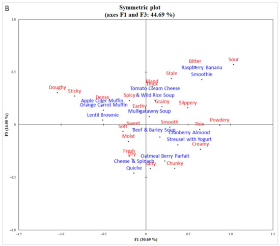 Symmetric plot derived from check-all-that-apply (CATA) responses of ten nutrient-dense foods during sensory evaluation without nutrition and health information. (A) Factors 1 and 2 explained 59.0% of the variability. (B) Factors 1 and 3 explained 45.0% of the variability.