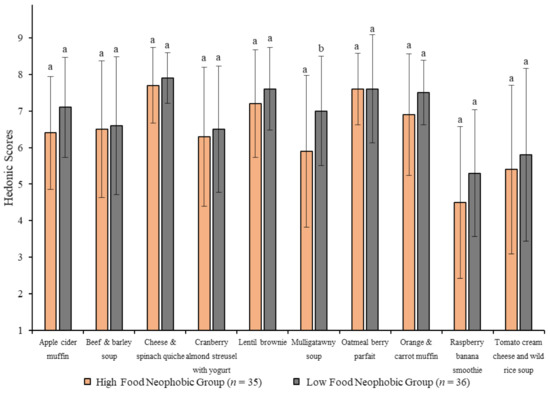 Means and standard deviations for overall liking of ten nutrient-dense foods between food neophobia subgroups without health and nutrition information. Y-axis represents the 9-point hedonic scale (1 = dislike extremely, 5 = neither like nor dislike, 9 = like extremely). For each food, values with different letters are significantly different (p < 0.05). n = 34 for cheese and spinach quiche and tomato cream cheese and wild rice soup in high food neophobia group due to missing data.