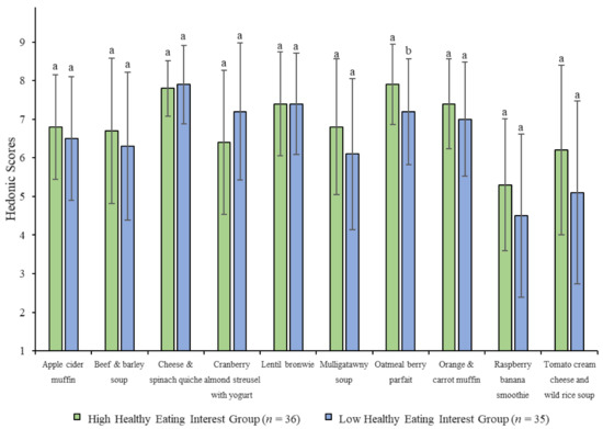 Means and standard deviations for overall liking of ten nutrient-dense foods between healthy eating interest subgroups without health and nutrition information. Y-axis represents the 9-point hedonic scale (1 = dislike extremely, 5 = neither like nor dislike, 9 = like extremely). For each food, values with different letters are significantly different (p < 0.05). n = 34 for cheese and spinach quiche and tomato cream cheese and wild rice soup in low healthy eating interest group due to missing data.