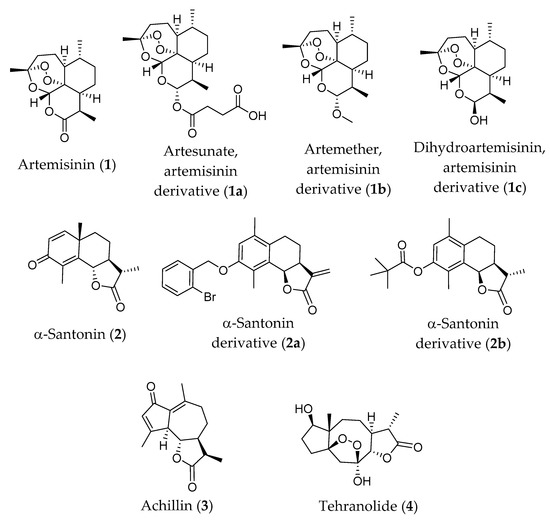 - Rustaiyan, A.; Faridchehr, A.; Bakhtiyar, M. Sesquiterpene Lactones of Iranian Compositae Family (Astraceae); Their Chemical Constituents and Anti-plasmodial Properties of Tehranolide (A Review). Orient. J. Chem. 2017, 33, 2188–2197. [Google Scholar] [CrossRef]