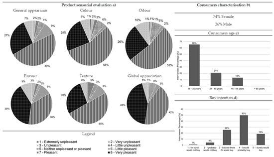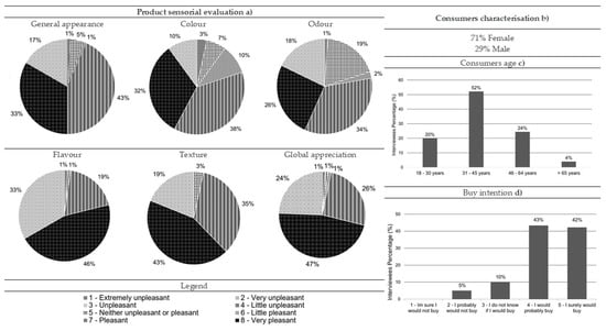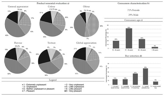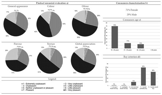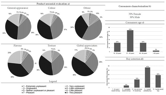 Results from the comber pastry consumer acceptance survey: (a) sensorial evaluation (product’s general appearance, colour, odour, flavour, texture and global appreciation), (b) consumers characterisation (gender percentage), (c) consumers age and (d) buy intention (n = 90).