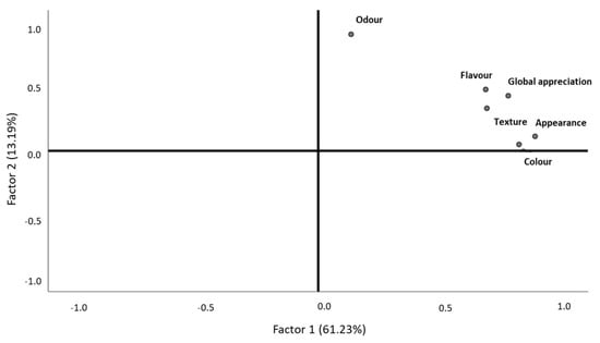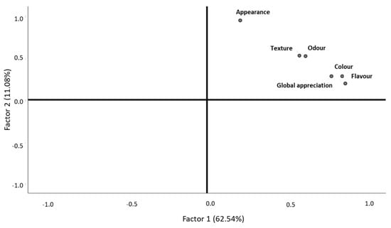 Descriptive statistics and exploratory data analysis were performed on 155 consumers sampled in the same region to characterize the fish consumer profile, the applicability of fish product innovation, and the importance of valorizing discarded fish. An exploratory factorial analysis (EFA) was performed to achieve a parsimonious representation of the associations among measured descriptors (that is, appearance, color, odor, flavor, texture, and global appreciation). Prior to running the EFA, the uniformity of the sample was tested by the Kaiser–Meyer–Olkin (KMO) measure of sampling adequacy. A KMO value of more than 0.50 was considered acceptable. In addition, the measure of sampling adequacy of the anti-image correlation matrix was all greater than 0.5. The presence of correlations between measured descriptors was tested using the Bartlett test of sphericity and was accepted when it was significant at p-value < 0.05. The correlation matrix was also analyzed and values of more than 0.3 were considered suitable []. As regards the sample size, there are several guiding rules cited in the literature [,,] and the lack of agreement is noted in all of them. In this work, it was an option to follow the recommendation denoted as a ratio of N:p, where N refers to the number of participants and p to the number of variables. Thus, the ratio of respondents to variables should be at least 10:1 [], which was satisfied by the data set under study. Principal component analysis (PCA) was used for factor extraction and orthogonal rotation (varimax option) to minimize the number of indicators that have high loading on one factor []. The number of factors was retained based on the eigenvalue >1.0 criterion (Kaiser criterion) and a plot of the eigenvalues, which shows the total variance associated with each other []. For all analyses, this resulted in the extraction of the first two factors.