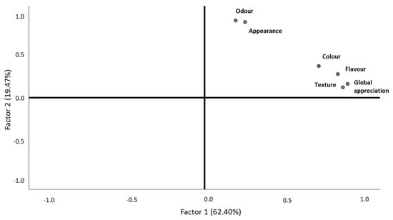 After the validation of the sample adequation (KMO = 0.798, Bartlett, p-value < 0.001), it was clear that black seabream ceviche texture, global appreciation, and flavor were related to each other (Figure 3). These descriptors belonged to the first factor, which explained 62.61% of the data variability and was labelled as “touch, taste, and overall sensory experience” (Figure 3, Table 4). The second factor, which explained 16.65% of the total data variability, was represented by color, appearance, and odor, which had less significance for the products’ description by consumers and was labelled as “sight and smell” (Figure 3, Table 4). These two groups characterized the product, although they did not have opposite behaviors (Figure 3). Consumers who rated texture, flavor and global appreciation with higher values considered these descriptors as the most important for black seabream ceviche characterization (Figure 3). Those who classified color with higher values also did so for appearance and odor (Figure 3).