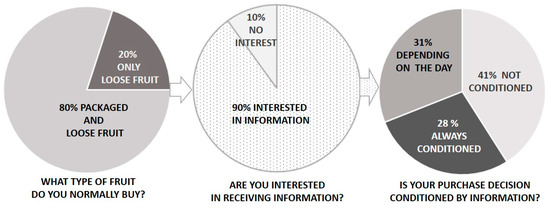 The first objective of this study was to evaluate consumer interest in fruit information and to determine if it conditions fruit selections (packaged vs. loose fruit). To this end, we asked the participants about their usual way of buying fruit and their interest in receiving information about it. Our results showed that for 80% of the participants, fruit purchases habitually include both packaged and loose fruit, while the other 20% only bought loose fruit (Figure 1).