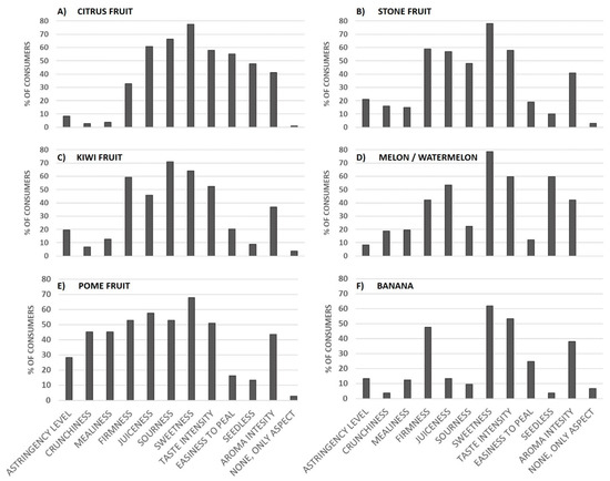 Another flavor-related attribute, level of sourness, was also pointed out as key information for facilitating consumer choice decisions with citrus or kiwi fruit (Figure 2A,C). It was also relatively important for pome and stone fruit (Figure 2B,E), but less relevant for bananas and melons/watermelons (Figure 2D,F).