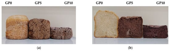 The firmness of bread crumb increased with the increasing level of GPP, ranging from 1.0 to 23.2 N for GP0 and GP10, respectively (p < 0.05). These results appear consistent with those previously reported for dough and bread quality attributes. The addition of GPP may have caused a weak gluten network formation with poor gas retention ability, thus contributing to the hardening effect of bread crumb. The present findings are in agreement with Sui et al. [57], where an increase in hardness was reported in wheat-based bread crumb with increasing levels of an anthocyanin-rich black rice extract powder. Similar results have also been reported in breads formulated with increasing levels of dietary fiber extracted from culinary banana bract [58].