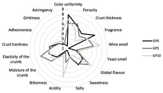 Substitution of wheat by GPP significantly influenced most of the selected sensory attributes (Figure 2). In terms of appearance, GPP inclusion significantly affected color uniformity, porosity, and crust thickness. In particular, crust thickness decreased as the fortification level increased. As for the aroma, increasing the amount of GPP in the dough significantly decreased the overall intensity of fragrance, defined as the characteristic bread scent. Instead, as expected, the wine smell significantly increased as the GPP inclusion increased. GPP inclusion also significantly affected the taste and flavor of the bread: in particular, the global flavor and acidity increased significantly with the GPP inclusion, while the sweet taste was reduced by the GPP inclusion. In terms of texture and tactile sensations, GPP fortification significantly influenced the crumb moisture, the crust hardness, the grittiness, and the astringency. Finally, the GPP addition did not have a significant impact on the overall acceptability of the product. Indeed, the overall acceptability recorded was 6.53 ± 1.62 for GP0 bread, 6.65 ± 1.69 for GP5, and 5.59 ± 2.12 for GP10. In all the samples, the threshold value of 5 was exceeded. Likewise, Walker et al. [63] reported that bread fortified with 10% of pinot noir grape pomace was acceptable by consumers, while an inclusion of 5% was the highest fortification level for bread made with grape seed flour [62].