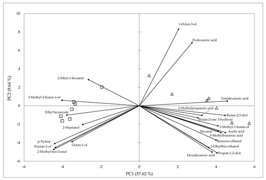 Principal component analysis plot representing the differentiation of Roja Mallorquina ewes’ cheeses based on the main volatile compounds. △, fresh soft cheese; □, ripened cheese.