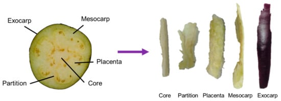 Tosataka was harvested in January 2018 from Kochi Agricultural Research Center and was divided into exocarp, mesocarp, outside placenta, inside placenta, and core (Figure 1). In addition, the eggplant fruit was divided into three parts from the root to the bottom: the fruit base (i.e., near the root), fruit center (the middle section), and fruit top (the part away from the root).