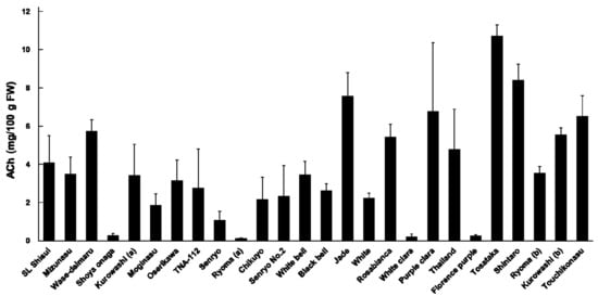 The ACh content among the varieties was different, with a 100-fold difference between varieties with the highest and lowest contents. Based on the effective intake amount (2.3 mg of ACh/day) of eggplant required to improve the blood pressure and psychological states [9], we estimated that the required intake of varieties with the lowest and highest ACh content is 2.1 kg FW/day to only 21 g FW/day. The effective dose was different among the eggplant varieties. Therefore, we recommend that future studies should focus on identifying or cultivating eggplants with a high ACh content to reduce the effective daily intake and reduce the intake cost.