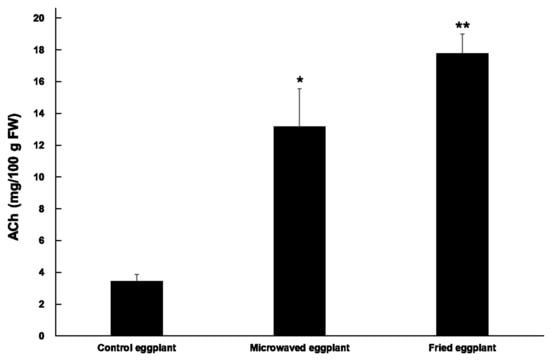 ACh content in the control, microwaved, and fried eggplant (n = 3). * p < 0.05, ** p < 0.01 versus the control eggplant, evaluated using Student′s t-test. ACh: acetylcholine; FW: fresh weight.