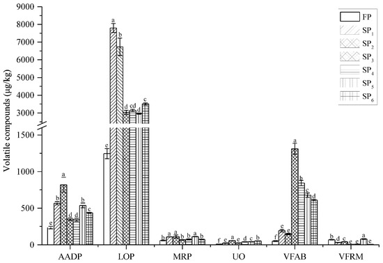 Concentration of volatile compounds according to possible origins of the fresh and stewed pork. Different letters are significantly different (p < 0.05) in each pork treatment group. FP, fresh pork; SP1, boiled pork with water; SP2, cooked pork with water and salt; SP3, stewed pork with water, salt and spices; SP4, stewed pork with water, salt, spices and soy sauce; SP5, stewed pork with water, salt, spices, soy sauce and sugar; SP6, stewed pork with water, salt, spices, soy sauce, sugar and cooking wine. LOP, Lipid oxidation products; AADP, Amino acid degradation products; MRP, Maillard reaction products; VFAB, Volatiles from aged brine; VFRM, Volatiles from raw meat; UO, Unknown origin.
