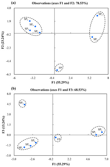 In order to clarify the differences in aroma profile of the fresh and stewed pork, a principal component analysis (PCA) was performed and showed in Figure 2a,b. The first principal component (PC1) explained 55.17%, the second principal component (PC2) explained 22.85% and the third principal component (PC3) explained 13.22% of the variations. The first three principal components (PCs) accounted for 91.24% of the total variance and were enough to explain the maximum variation in all original data of the pork samples. As can be seen in Figure 2a, the PC1 and PC2 showed a clear-cut separation of the samples into three major groups. Among them, the sample dot of FP was located in the fourth quadrant, and sample dots representing SP3, SP4, SP5, and SP6 were located in the second quadrant and could be recognized as one cluster, while sample dots of SP1 and SP2 located in the first and fourth quadrant were considered as a group because of their relatively closer distance. As shown in Figure 2b, the fresh and stewed pork samples were divided into four groups in PC1 and PC3, that is, group I: FP; group II: SP1 and SP2; group III: SP3; group IV: SP4, SP5, and SP6. The four group of sample points were located in the different quadrants indicating that the overall aroma of each group of samples were different. Moreover, SP4, SP5, and SP6 samples was close and located in the third quadrant. It can be concluded that the overall flavour of SP4, SP5, and SP6 was similar each other. Similarly, so was SP1 and SP2. It can be also found that the flavour of samples SP4, SP5 and SP6 was significantly different from that of sample SP3 in Figure 2a,b. This showed that the flavour compounds of stewed pork were also affected by soy sauce, sugar, and cooking wine.