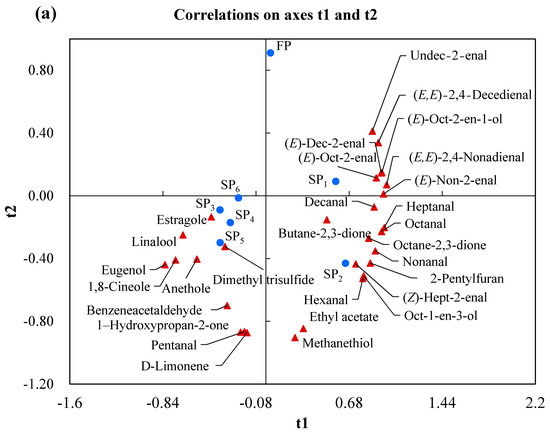 (a) Loading biplot of t1 and t2 of the model performed after PLS-DA of the volatile compounds in different pork samples (R2X = 0.968, R2Y = 0.818 and Q2 = 0.628). (b) Heat map of the correlations between volatile compounds and the pork samples. FP, fresh pork; SP1, stewed pork with water; SP2: stewed pork with water and salt; SP3: stewed pork with water, salt and spices; SP4: stewed pork with water, salt, spices and soy sauce; SP5: stewed pork with water, salt, spices, soy sauce and sugar; SP6: stewed pork with water, salt, spices, soy sauce, sugar and cooking wine. The blue circle dots represent the fresh and stewed pork and the red triangle dots represent the odour-active compounds.