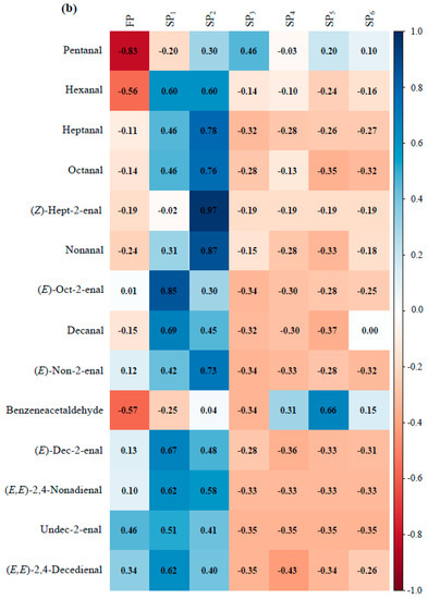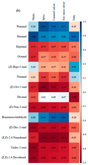 PLSR was employed to establish the relationship between the five sensory descriptors of the fresh and stewed pork and the odour-active compounds analysed by GC-MS/O and GC × GC-TOFMS, and the correlation coefficient between them was expressed in the heat map. As shown in Figure 5a, most of the X-matrix (contribution ratios of the odour-active compounds) and Y-matrix (intensities of the sensory attributes) are loaded around the circle (r2 = 100%, r2 = represent the degree of interpretation). The model quality (Q2 = 0.846) ≥ 0.50 indicated that they were well explained by the PLSR model. The first two components explained 74.0% of X-matrix and 92.7% of Y-matrix. The dots corresponding to sample SP1 and SP2 had overlap in the second quadrant, and the samples points of SP3, SP4, SP5 and SP6 were close in the fourth quadrant, and as well as FP was found in the third quadrant. So, the fresh and stewed pork samples can be divided into three group and this result was consistent with previous PCA plots (Figure 2a). According to Figure 5a,b, it can be observed that SP3, SP4, SP5, and SP6 were characterized by soy sauce, caramel and spicy odour because of their short distance, and the three aroma attributes aforementioned were positively correlated with pentanal, benzeneacetaldehyde, 1,8-cineole, 1-hydroxypropan-2-one, D-limonene, ethyl acetate, eugenol, methanethiol, and dimethyl trisulfide with a high correlation coefficient (0.60 ≤ r ≤ 0.92). On the contrary, the soy sauce, caramel and spicy notes located in the right side of the loading plot were strongly and negatively correlated with some aldehydes (heptanal, nonanal, (E)-oct-2-enal, (E)-non-2-enal, (E)-dec-2-enal, (E,E)-2,4-nonadienal, undec-2-enal and (E,E)-2,4-nonadienal) and unsaturated alcohols like (E)-oct-2-en-1-ol. SP1 and SP2 on the upper left side of loading plot were mainly descriptive fatty and meaty odour, which were in accordance with the descriptive sensory analysis. These two attributes were highly associated with hexanal, oct-1-en-3-ol and 2-pentylfuruan. Moreover, FP was located far from these flavour attributions and most volatiles, which indicated that there was not the unique flavour of the fresh pork.